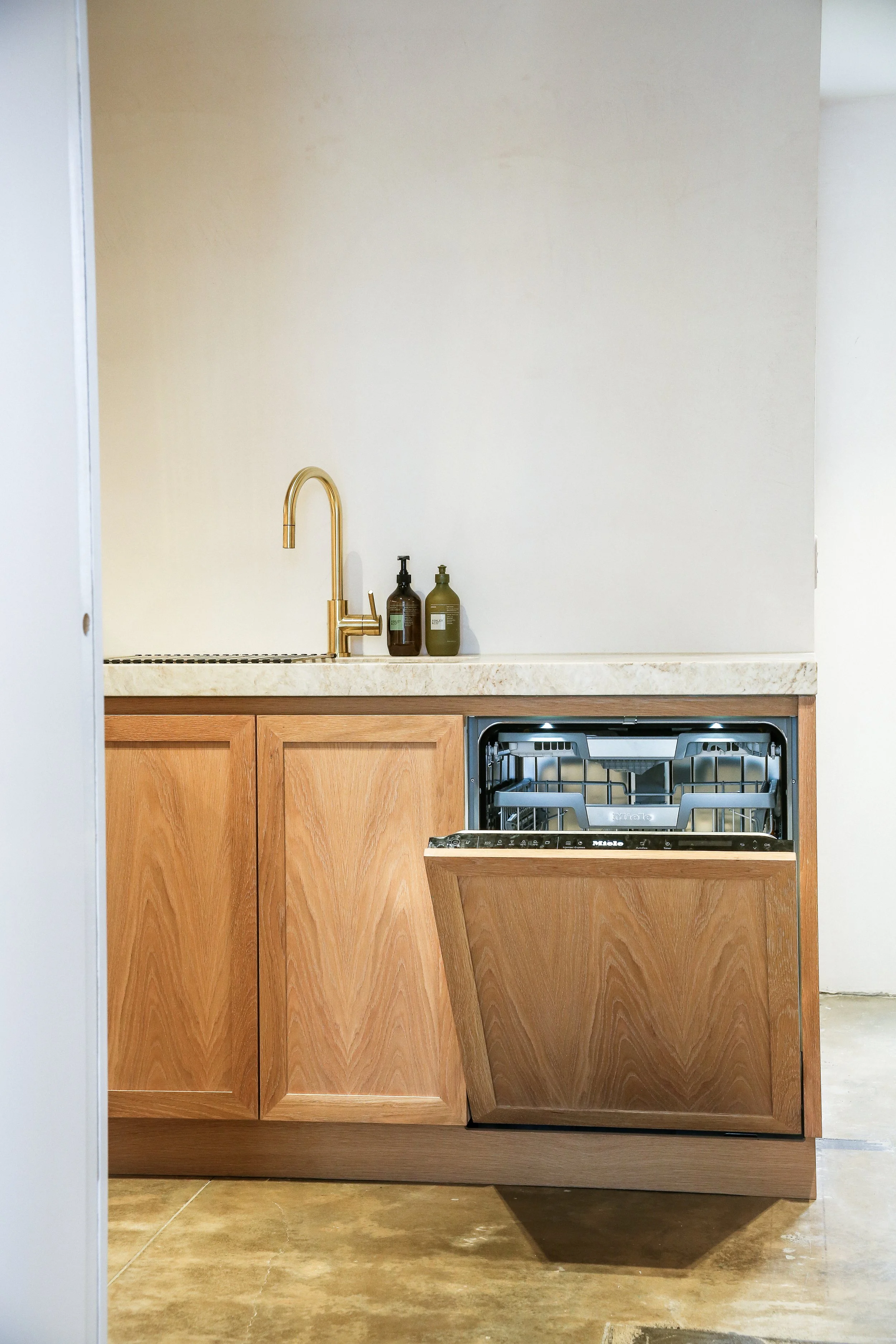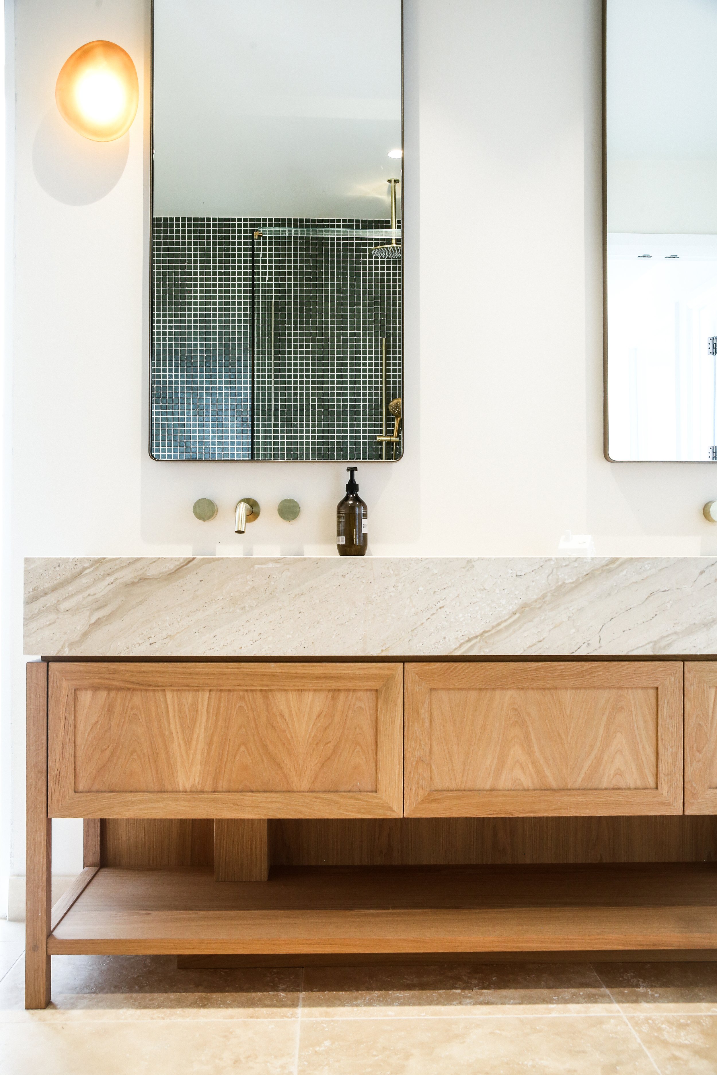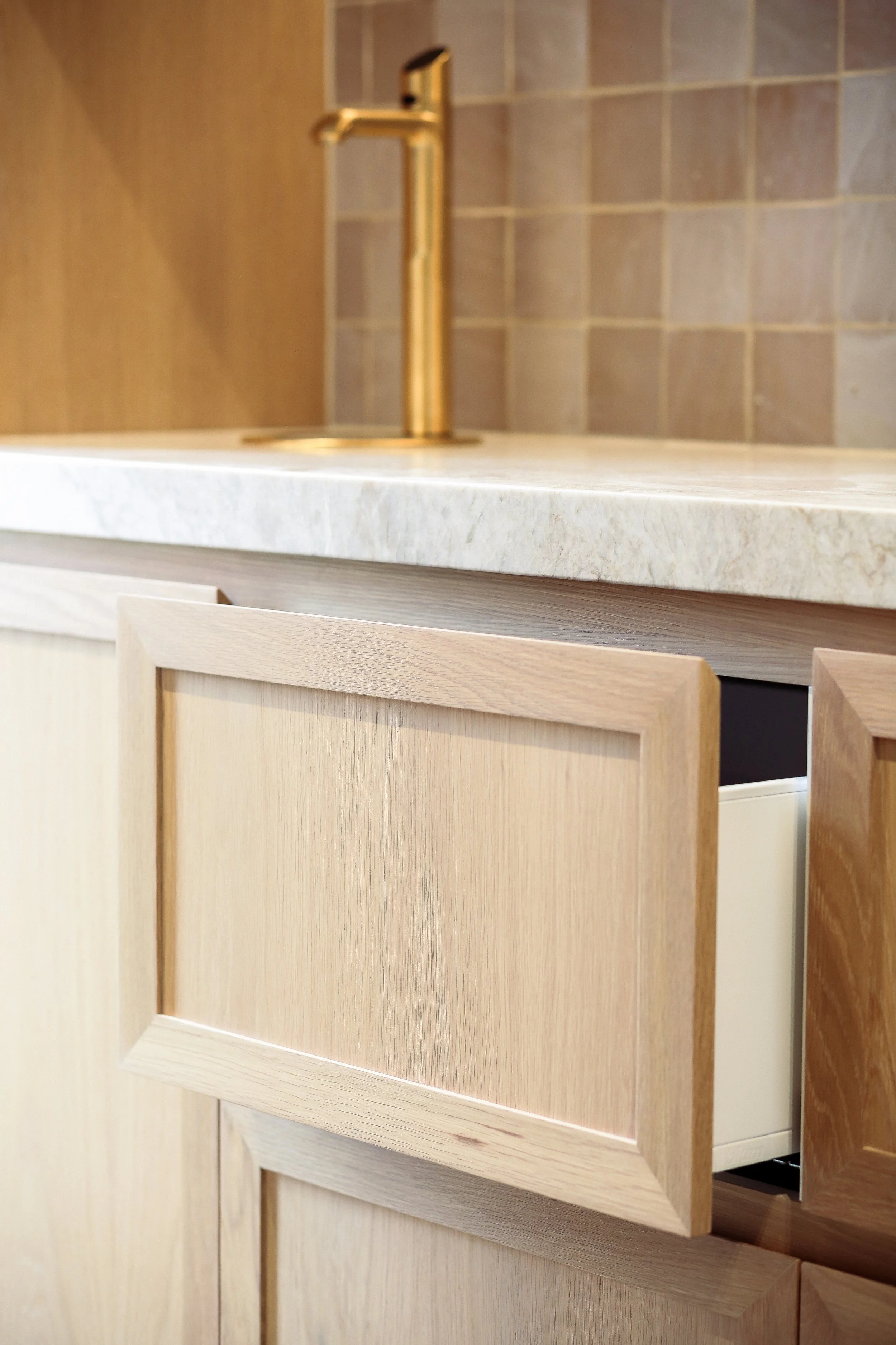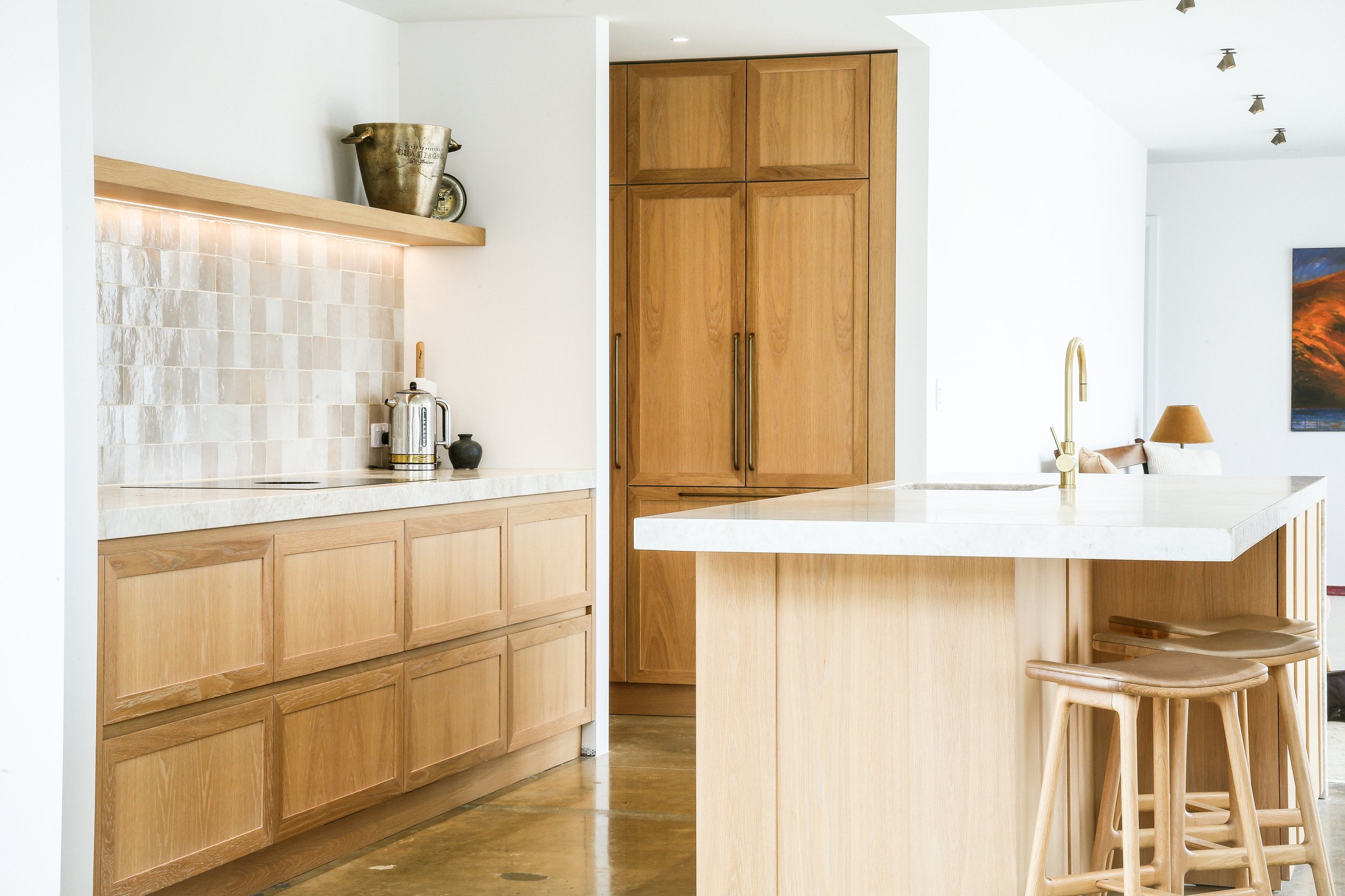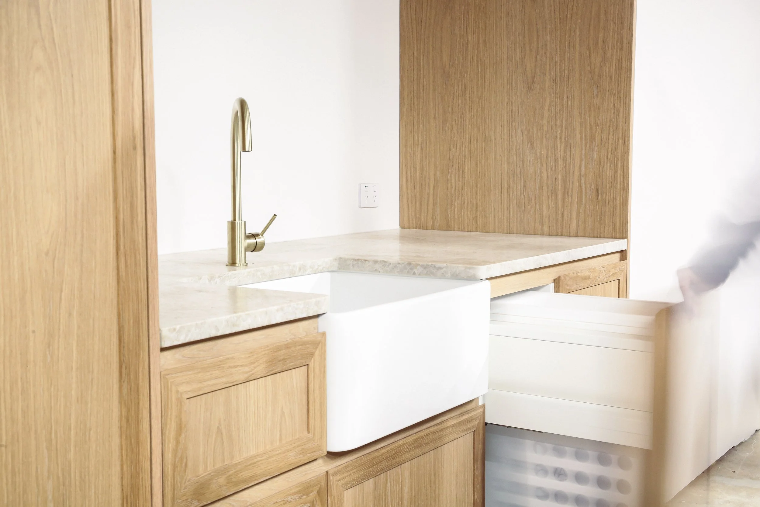 Materials: American White Oak Frame & Panel Doors, Taj Mahal Stone Benchtops, White Carcase.