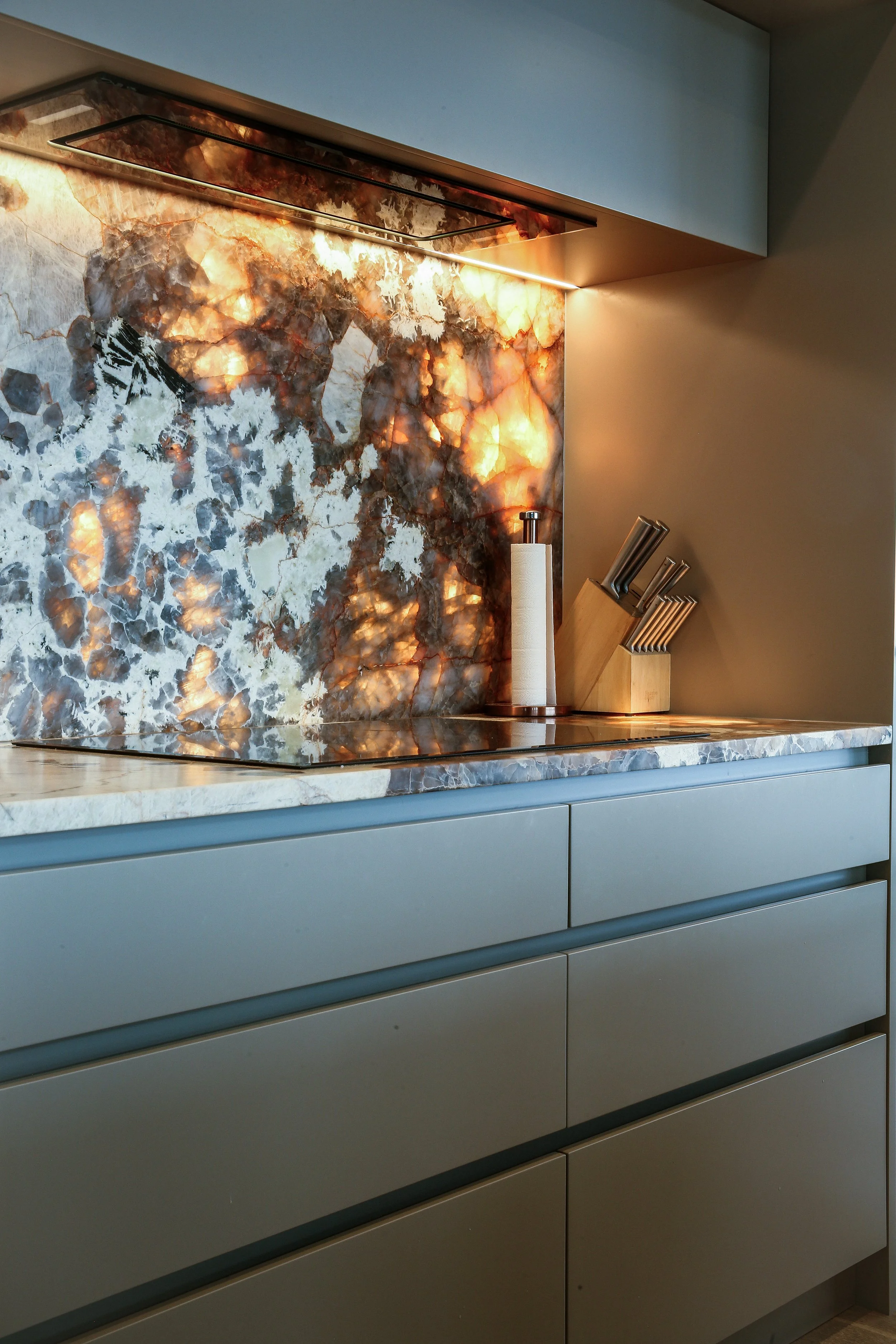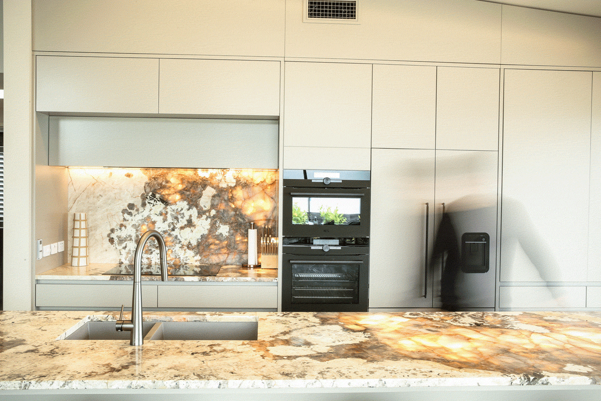 Materials: Lacquered MDF, underlit Patagonia stone benchtops, white carcase.